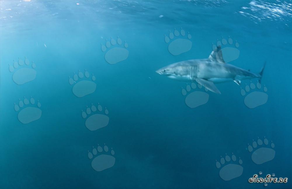 Beschreibung: Der Große Weiße Hai (Carcharodon carcharias) durchquert majestätisch die Gewässer in der Nähe von Geyser Rock und Dyer Island vor der Küste Südafrikas. Seine imposante Brustflosse scheint beinahe greifbar nah, während er auf der Jagd nach Beute an die Wasseroberfläche kommt. Dieser Topraubfisch der Meere ist eine faszinierende Kreatur mit einer reichen Geschichte und einer entscheidenden Rolle im Ökosystem des Ozeans.