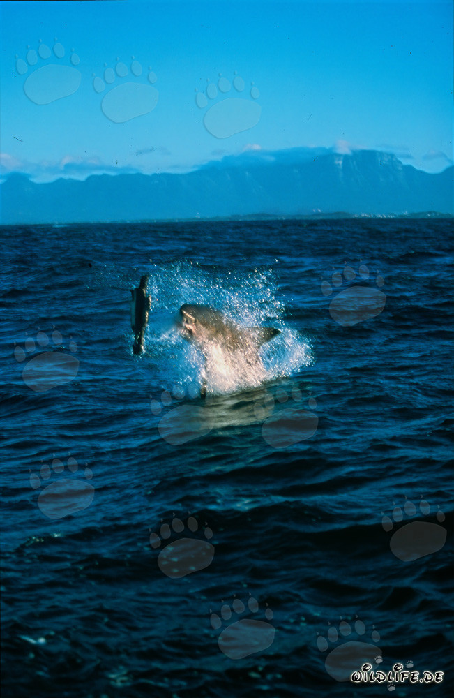 Description: The majestic Great White Shark (Carcharodon carcharias) breaches spectacularly near Seal Island, South Africa. A boat is luring these fascinating creatures with a neoprene seal decoy. Suddenly, the massive shark emerges and seizes the decoy with impressive precision. Experience the breathtaking beauty and energy of this unforgettable moment in the animal kingdom.