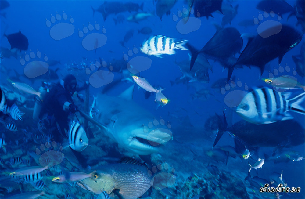 Rodeado de muchos peces de arrecife, un tiburón toro (Carcharhinus leucas) nada cerca de un buzo. (00018363)