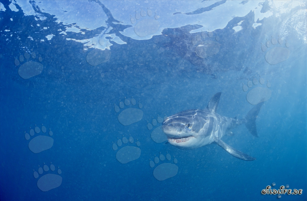 Descripción: Un pequeño tiburón blanco (Carcharodon carcharias) se encuentra a seis millas náuticas de la costa de Gansbaai, cerca de Dyer Island y Gyser Rock. Estos tiburones nacen completamente desarrollados, miden de 1,10 a 1,60 metros, y están solos. Se alimentan de peces pequeños y calamares. Los jóvenes tiburones son extremadamente cautelosos y huyen cuando aparece un tiburón adulto. Solo unos pocos llegan a la edad adulta.