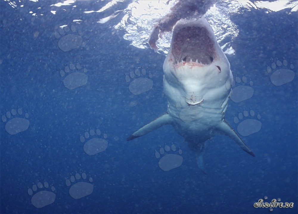 La partie inférieure du grand requin blanc (Carcharodon carcharias) brille en blanc alors qu'il atteint l'appât de pêche en montant rapidement (00010326)