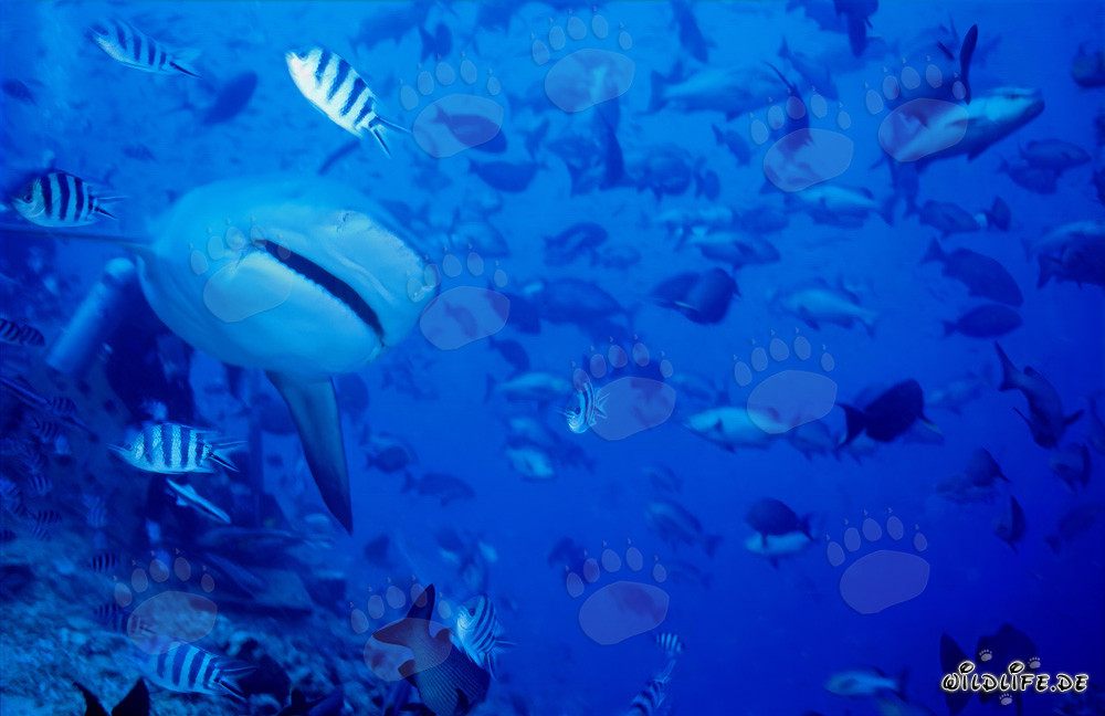 Inmitten einer Fischansammlung ist ein Bullenhai an einem Taucher vorbei geschwommen und nähert sich frontal. (00018986)