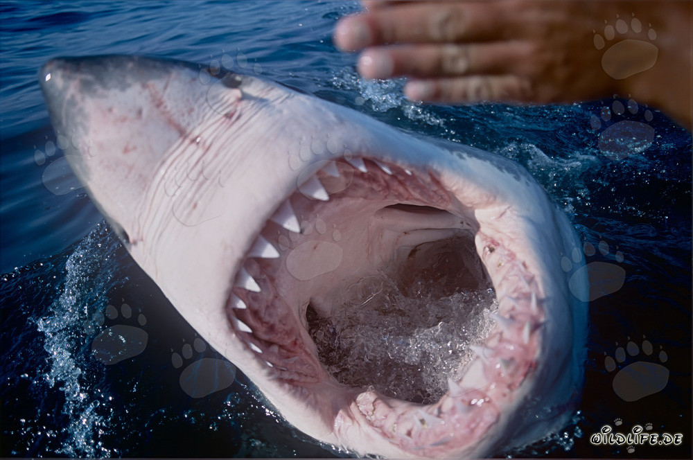 Beschreibung: Der Weiße Hai (Carcharodon carcharias) ist ein faszinierendes Raubtier der Meere und gehört zur Familie der Makrelenhaie. Dieses beeindruckende Exemplar zeigt seine beeindruckenden 26 scharfen dreieckigen Zähne im Oberkiefer und 24 nadelspitzen Fangzähne im Unterkiefer, während es vor der Küste von Südafrika auftaucht. Der Weiße Hai ist bekannt für seine Bisskraft von bis zu drei Tonnen pro Quadratzentimeter und seine Fähigkeit, auch große Beute zu jagen. Erfahren Sie mehr über dieses majestätische Tier und seine Rolle im marinen Ökosystem.