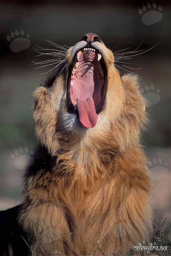 Majestätischer afrikanischer Löwe öffnet weit sein imposantes Maul in Gefangenschaft (00010620)