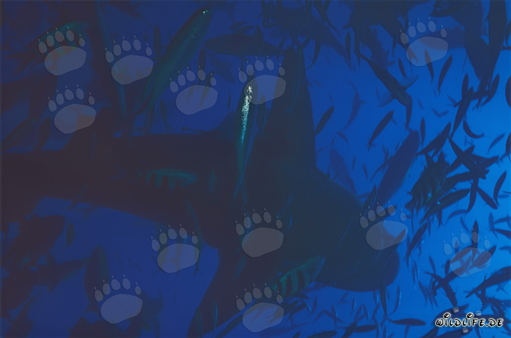 Description: The Bull Shark, also known as the Bull Shark or Zambezi Shark (Carcharhinus leucas), is a fascinating species of shark that thrives in both salt and freshwater environments. With an imposing size of up to 3.5 meters and a weight of over 200 kilograms, it is one of the most impressive predators in the world's oceans. Its self-assured behavior and curiosity make it an interesting subject for underwater photographers. This image captures a majestic Bull Shark surrounded by a variety of other fish swimming in the gentle backlight.