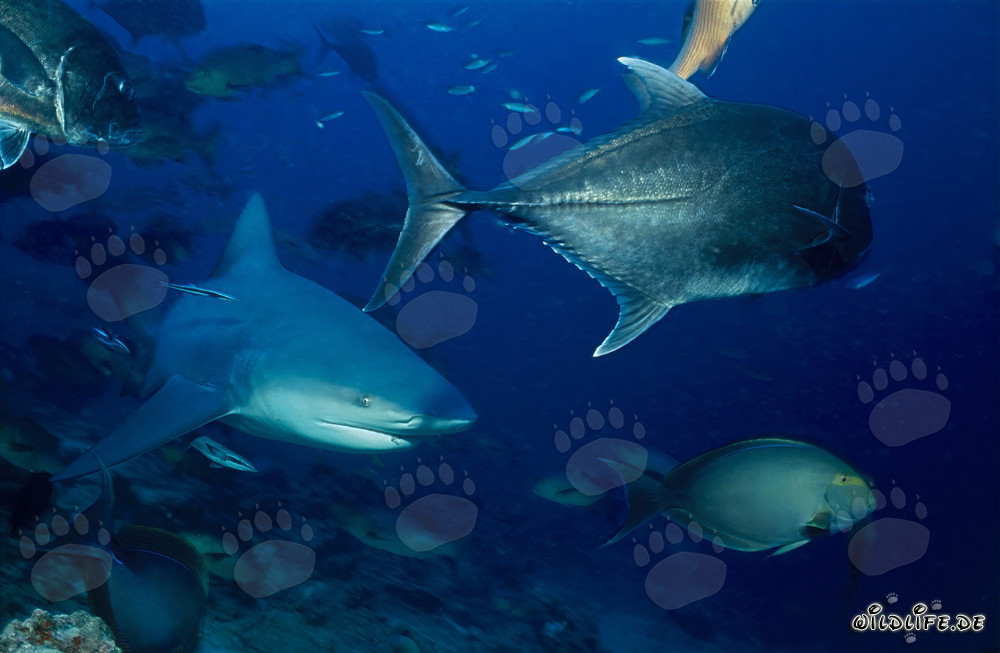 Description: The Bull Shark (Carcharhinus leucas) is an impressive species of shark, often considered dangerous. This particular specimen is accompanied by a majestic Giant Trevally and a colorful surgeon fish. Immerse yourself in the world of these fascinating marine creatures and discover the beauty and grace of the ocean.