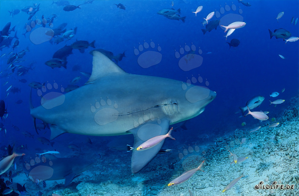 A Bull Shark caught in the Shark Reef of Beqa Lagoon with a fishing hook in its gills (00018268)
