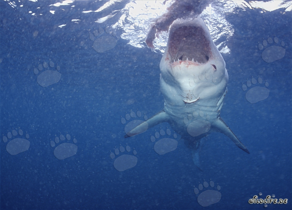 The bottom of the Great White Shark (Carcharodon carcharias) is shining white while as he reaches the fish bait in the steep ascent (00010326)