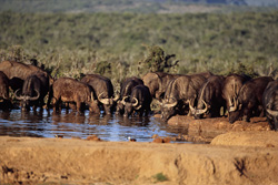 African Buffalo (Syncerus caffer) are impressive animals that live in stable herds and play a central role in Africa's ecosystem. These robust buffaloes are known for their strength and ability to adapt to various habitats, from dense forests to open savannas. The African Buffalo primarily feed on grass but are also attracted to leaves and herbs, making them versatile herbivores. Their complex social structures and long-lasting bonds within herds are fascinating and contribute to population stability. Natural predators of the African Buffalo include lions, while hyenas and crocodiles threaten them in vulnerable regions. Despite their generally peaceful nature, African Buffalo can become extremely dangerous when threatened or injured. Protecting these majestic animals is crucial for maintaining the balance of African wilderness. By preserving their habitats and combating poaching, we help ensure that future generations can appreciate the beauty and significance of the African Buffalo.
