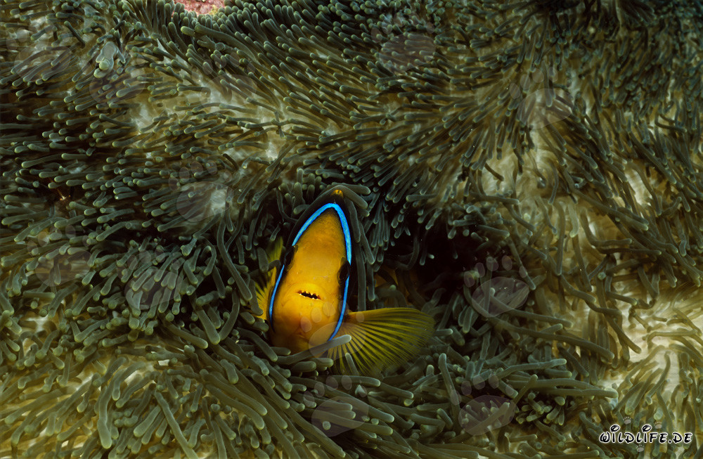 Descripción: El pez payaso de aletas naranjas, también conocido como pez anémona de aletas naranjas o Amphiprion chrysopterus, es un fascinante habitante marino. Con una longitud promedio de aproximadamente 15 cm, vive en estrecha simbiosis con diferentes especies de anémonas. Este retrato muestra los colores brillantes y las características distintivas de este pez tropical. Su hábitat se encuentra principalmente a lo largo de los arrecifes exteriores en profundidades de hasta 30 m. Esta toma se realizó en la pintoresca laguna de Beqa frente a la costa de Vitu Levu, Fiyi, en el claro Pacífico Sur.