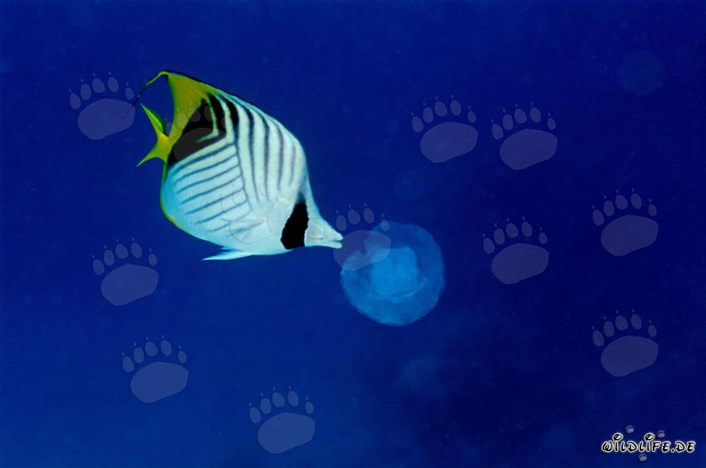 Encuentro fascinante: pez mariposa de bandera y medusa luminosa en el Mar Rojo (00020273)
