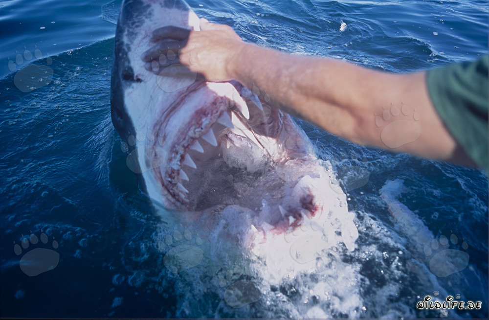 Al tocar su nariz, el tiburón blanco abre su boca (00003423)