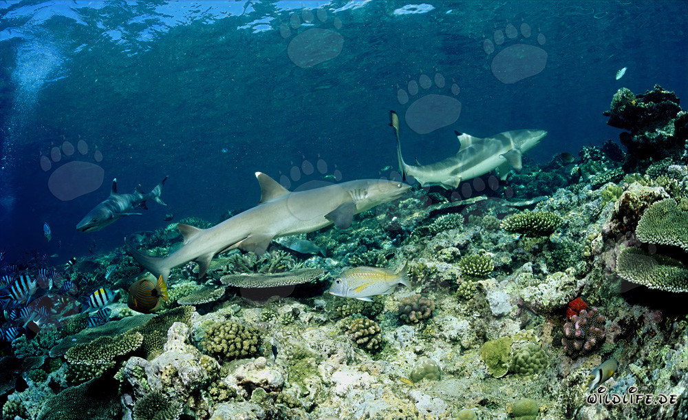 Descripción: El tiburón punta blanca (Triaenodon obesus) es un tiburón pequeño que generalmente no supera los 1,6 m. Esta especie se distingue por su cuerpo esbelto, su cabeza ancha y corta, y sus aletas dorsal y caudal blancas. Es uno de los tiburones más comunes que se encuentran en los arrecifes de coral del Indo-Pacífico. Por lo general, el tiburón punta blanca se encuentra en o cerca del fondo marino en aguas claras, a profundidades de 8 a 40 m. Sigue al tiburón punta negra a través del colorido mundo submarino.
