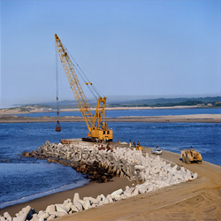 El Puerto de Agua Profunda de Richards Bay es una infraestructura marítima significativa ubicada en la costa este de la República de Sudáfrica, en la provincia de Natal, aproximadamente a 150 km al norte de Durban. La construcción comenzó en 1972 y se completó en cinco años. El puerto de aguas profundas facilita principalmente la exportación de carbón extraído en la provincia oriental de Transvaal. Inicialmente, la Laguna de Richards Bay era un sitio natural intacto preservado como área de conservación hasta la expansión del puerto. El dique de 4.5 kilómetros de longitud y la estructura de regulación de mareas aseguran un control eficiente del nivel del agua y protección contra las fuertes olas del Océano Índico. Con dos grandes muelles y extensas operaciones de dragado, el puerto puede albergar barcos de hasta 250,000 toneladas de peso muerto. La construcción involucró más de 660,000 m³ de concreto y 170 millones m³ de dragado, apoyados por modernos dragas de corte y dragas tolva. El Puerto de Richards Bay es un elemento central en la economía de exportación de Sudáfrica y una obra maestra de la ingeniería portuaria.