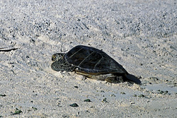 La Tortuga Verde Marina (Chelonia mydas) es una de las especies de tortugas marinas más conocidas y fascinantes a nivel mundial. Originalmente abundante, hoy se estima que quedan alrededor de 200,000 individuos en los océanos. Anualmente, entre 200 y 350 hembras regresan a las playas de anidación de las French Frigate Shoals en el grupo de islas hawaianas del noroeste. Este atolón remoto ofrece condiciones ideales para las aves marinas y la misma Tortuga Verde Marina. Mientras las albatros crían a sus crías, otras especies como los tiburones tigre también visitan las Shoals. En las lagunas y playas del Midway Atoll, se pueden observar las estrictamente protegidas Tortugas Verdes Marinas, que, debido a su sensibilidad a las influencias humanas, no anidan aquí sino que solo vienen en busca de alimento. Con una longitud de caparazón de 80 a 120 cm y un peso de hasta 250 kg, estas tortugas son excelentes buceadoras y pueden permanecer bajo el agua durante largos períodos. Su dieta incluye pradera marina, algas, esponjas, corales blandos, medusas, cangrejos, calamares y peces. Los adultos son predominantemente vegetarianos. Históricamente, las Tortugas Verdes Marinas también se conocían como 'tortugas de sopa' y se consideraban un manjar en algunas culturas. Hoy en día, están en grave peligro de extinción debido a la destrucción de playas de anidación, la contaminación de hábitats y el uso intensivo como fuente de alimento. Por lo tanto, los esfuerzos de conservación son esenciales para asegurar la supervivencia de estas notables criaturas.
