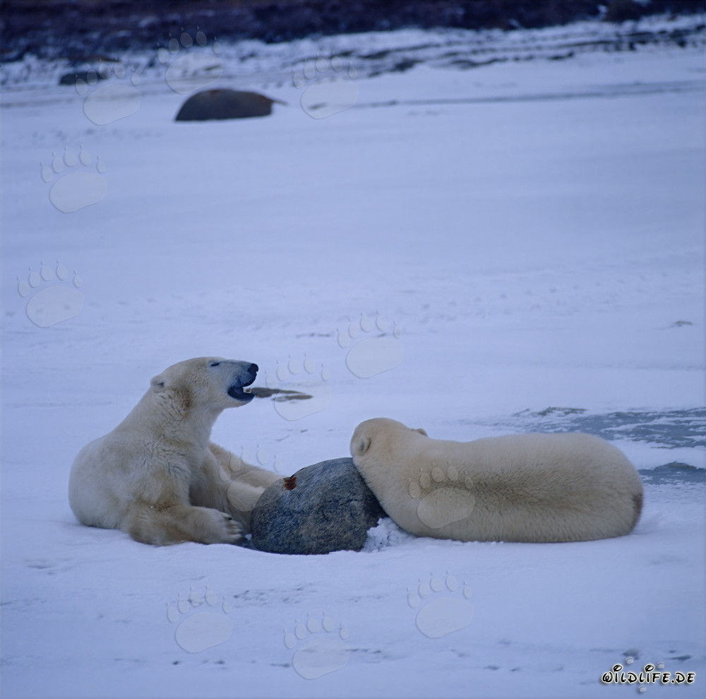 Deux impressionnants ours polaires se détendent dans la sauvagerie glaciale de la baie d'Hudson (00090077)