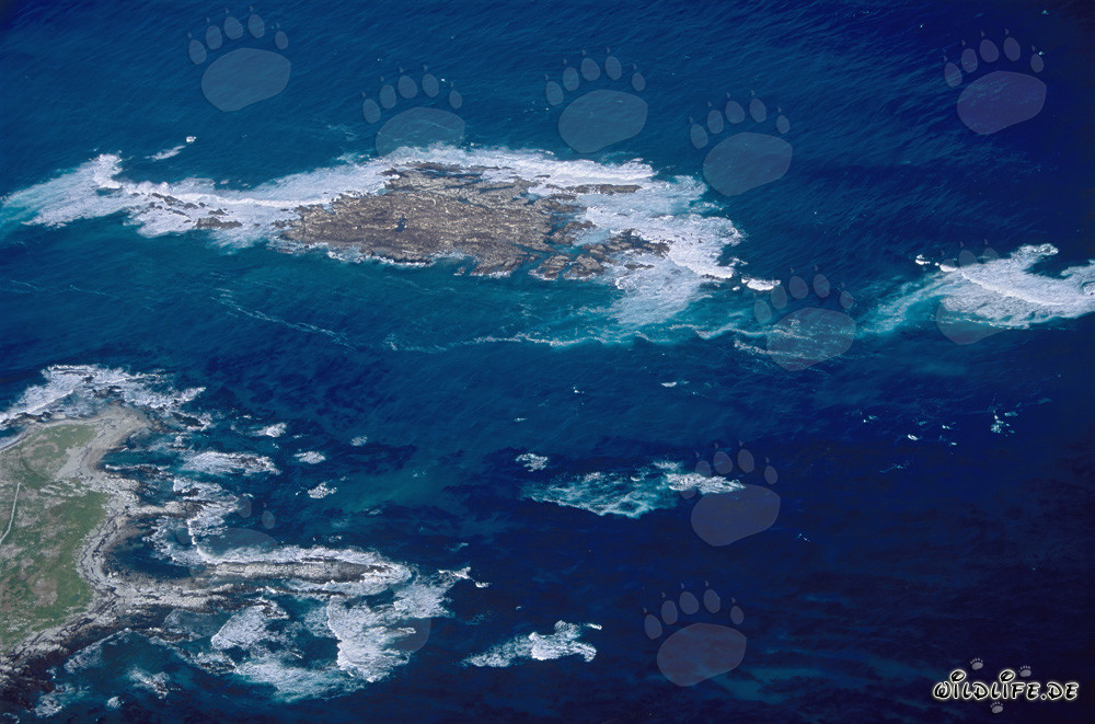 Description: Dyer Island, Shark Alley et Geyser Rock - Une image aérienne époustouflante capturant la beauté et la diversité de la côte sud-africaine. Dyer Island abrite des manchots du Cap, des cormorans et d'autres oiseaux marins, tandis que Geyser Rock abrite une importante colonie de phoques à fourrure d'Afrique du Sud. Découvrez la fascinante relation entre les phoques et les grands requins blancs qui chassent dans Shark Alley.