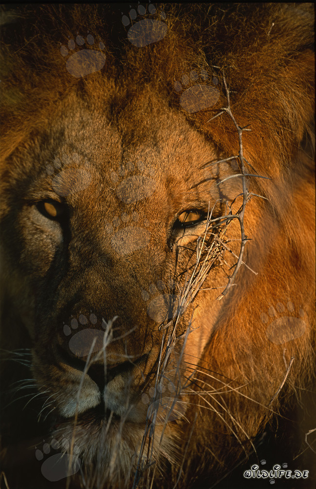 Description: Le majestueux lion africain (Panthera leo) se montre dans la lumière dorée du matin. En raison de la sécheresse persistante, le vert dans la brousse a presque totalement disparu, affaiblissant ainsi les proies et les rendant faciles pour des prédateurs tels que les lions.