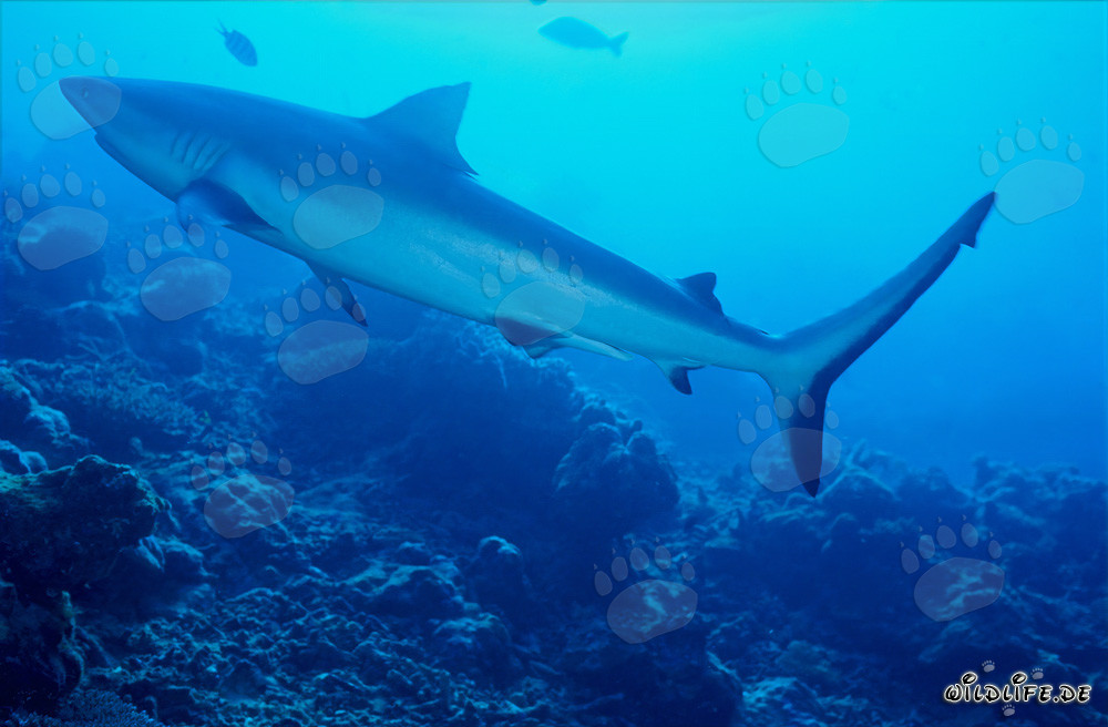 Description: Le requin gris (Carcharhinus amblyrhynchos) est un requin courant dans l'océan Indien et le Pacifique. Il est souvent vu dans les eaux peu profondes près des récifs coralliens. Avec son museau large et rond et ses grands yeux, c'est une vision fascinante. Cette espèce peut être distinguée des espèces similaires par sa première nageoire dorsale unie ou blanche, les pointes sombres sur les autres nageoires et le large bord noir sur sa nageoire caudale. La plupart des individus mesurent moins de 1,9 m de long. Les requins gris sont des prédateurs rapides et agiles, se nourrissant principalement de poissons et de céphalopodes.