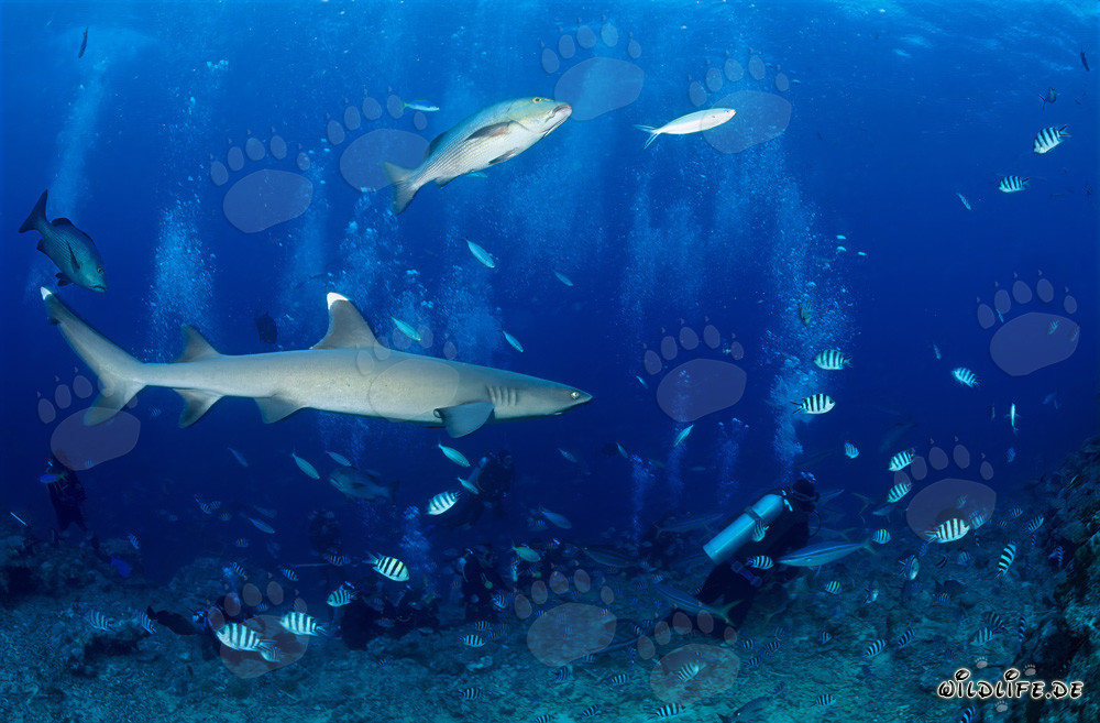 Description: Le requin à pointes blanches (Triaenodon obesus) est une petite espèce de requin qui ne dépasse généralement pas 1,6 m de long. Cette espèce est reconnaissable à son corps élancé, sa tête courte mais large, et ses nageoires dorsales et caudales blanches pointues. Le requin à pointes blanches est l'un des requins les plus courants que l'on trouve dans les récifs coralliens de l'Indo-Pacifique. Typiquement, le requin à pointes blanches est trouvé sur ou près du fond marin dans une eau claire à des profondeurs de 8 à 40 m.