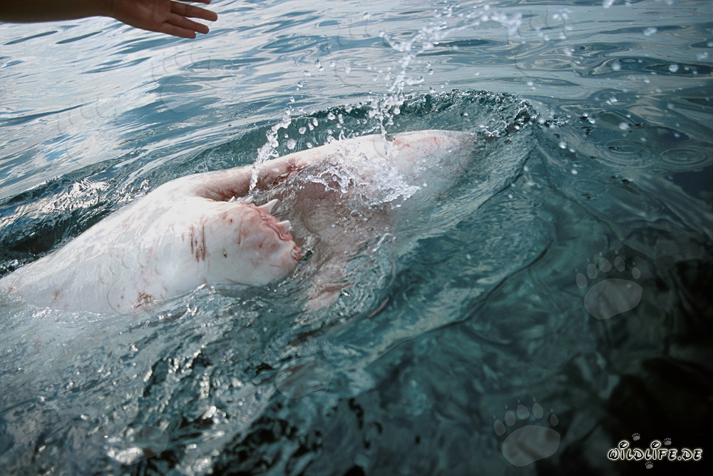 La scia di feromoni dell'esca per pesci ha attirato il Grande Squalo Bianco verso la nostra barca. Scopri il comportamento affascinante di questo maestoso abitante marino. (00000427)