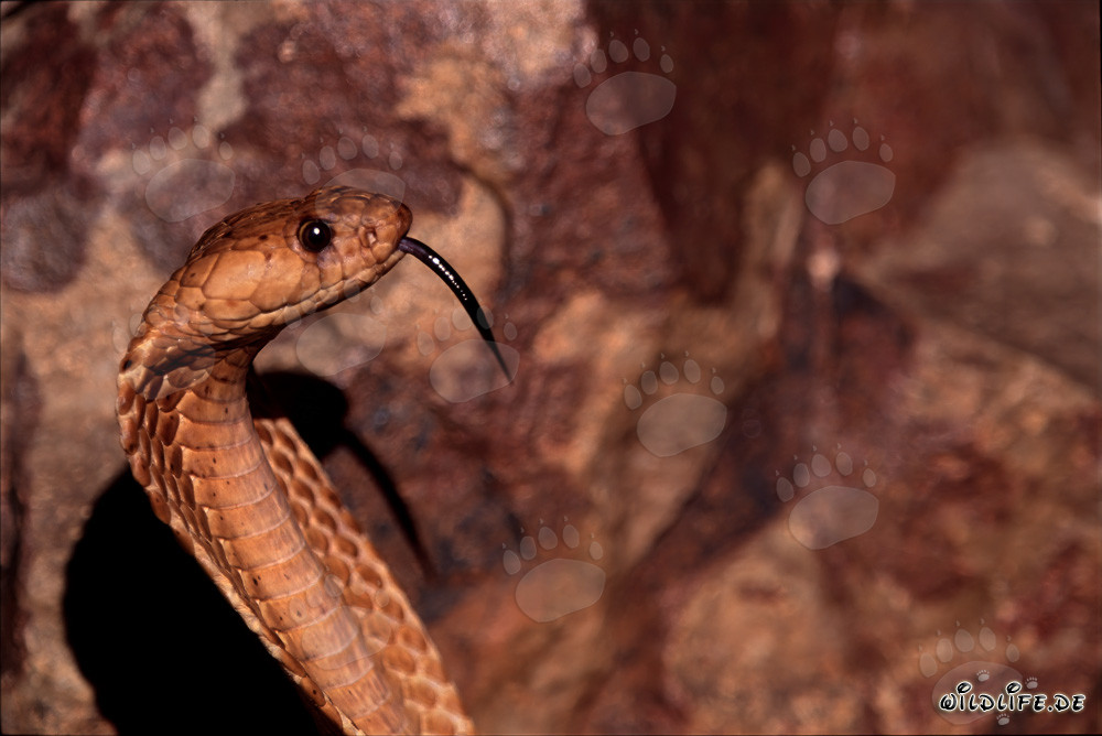 Descrizione: Il cobra del Capo (Naja nivea) è un serpente velenoso affascinante che abbiamo scoperto nelle inaccessibili montagne di Gansbaai, nel Capo Occidentale sudafricano. Questo serpente, conosciuto anche come cobra del Capo giallo e maculato, impressiona per le sue dimensioni fino a 2,1 metri e le sue sorprendenti variazioni di colore giallo, rossastro o maculate. Vive in aree secche e rocciose e possiede il veleno più potente di tutte le specie di cobra africane. Un morso può essere mortale in pochi minuti. Questa foto mostra il cobra del Capo in tutta la sua maestosa bellezza.