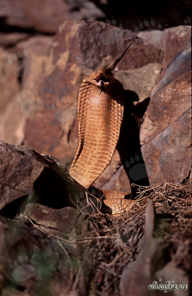 Descrizione: Il Cobra del Capo, noto anche come Naja nivea, è un serpente velenoso affascinante che vive nelle remote montagne di Gansbaai nel Western Cape, Sudafrica. Questa specie di serpente mostra un'imponente posizione minacciosa, specialmente quando si sente in pericolo. Scopri di più sulle caratteristiche impressionanti e sul veleno pericoloso di questo Cobra del Capo.