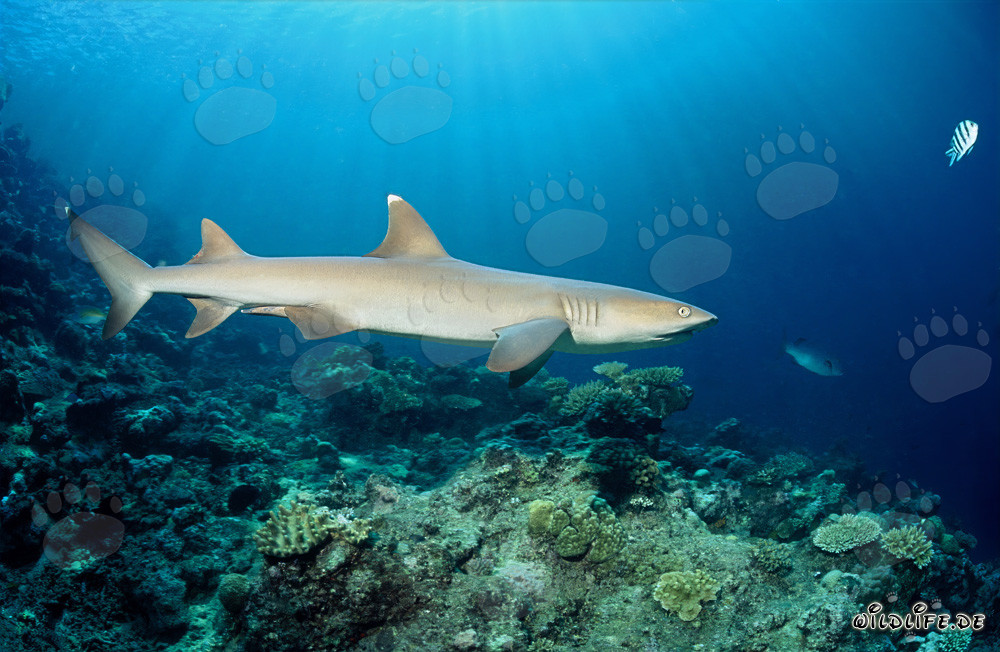 Elegante squalo pinna bianca che esplora il colorato reef di corallo (00018446)