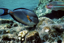 Il Dottore marino arabo (Acanthurus arabicus) è un membro notevole della fauna marina, originario delle acque calde dell'Oceano Indiano. Con il suo corpo ellittico e le distintive strisce bianche e nere sui flanchi, questo pesce è facilmente riconoscibile. La bocca terminal e gli occhi posizionati in alto conferiscono un aspetto unico. Il bozzo sulla fronte dei maschi più anziani è una caratteristica distintiva che aiuta nell'identificazione delle specie. Il Dottore marino arabo è noto per il suo comportamento imponente, in cui le pinne dorsale, ana e caudale vengono sollevate per respingere i rivali o attrarre le femmine. Queste pinne non sono solo importanti per il comportamento, ma rappresentano anche un elemento estetico notevole con la loro colorazione nera con bordature blu. Il Dottore marino arabo svolge un ruolo vitale nell'ecosistema contribuendo al controllo delle alghe, mantenendo così la salute delle barriere coralline. La sua adattabilità a vari habitat e la sua resilienza ai cambiamenti ambientali lo rendono un soggetto affascinante per scienziati e biologi marini. I colori vibranti e il comportamento del Dottore marino arabo lo rendono anche un soggetto popolare nella fotografia subacquea, dove la sua eleganza e grazia sono splendidamente messe in risalto. Oltre al suo valore estetico, il Dottore marino arabo contribuisce economicamente all'industria del turismo, poiché subacquei e nuotatori apprezzano la possibilità di osservare queste impressionanti creature nel loro habitat naturale. Proteggere il Dottore marino arabo è quindi cruciale non solo per la preservazione della diversità biologica, ma anche per la stabilità dei sistemi ecologici in cui risiede. Attraverso pratiche di pesca sostenibile e la conservazione degli habitat, è possibile garantire che il Dottore marino arabo rimanga preservato per le future generazioni.